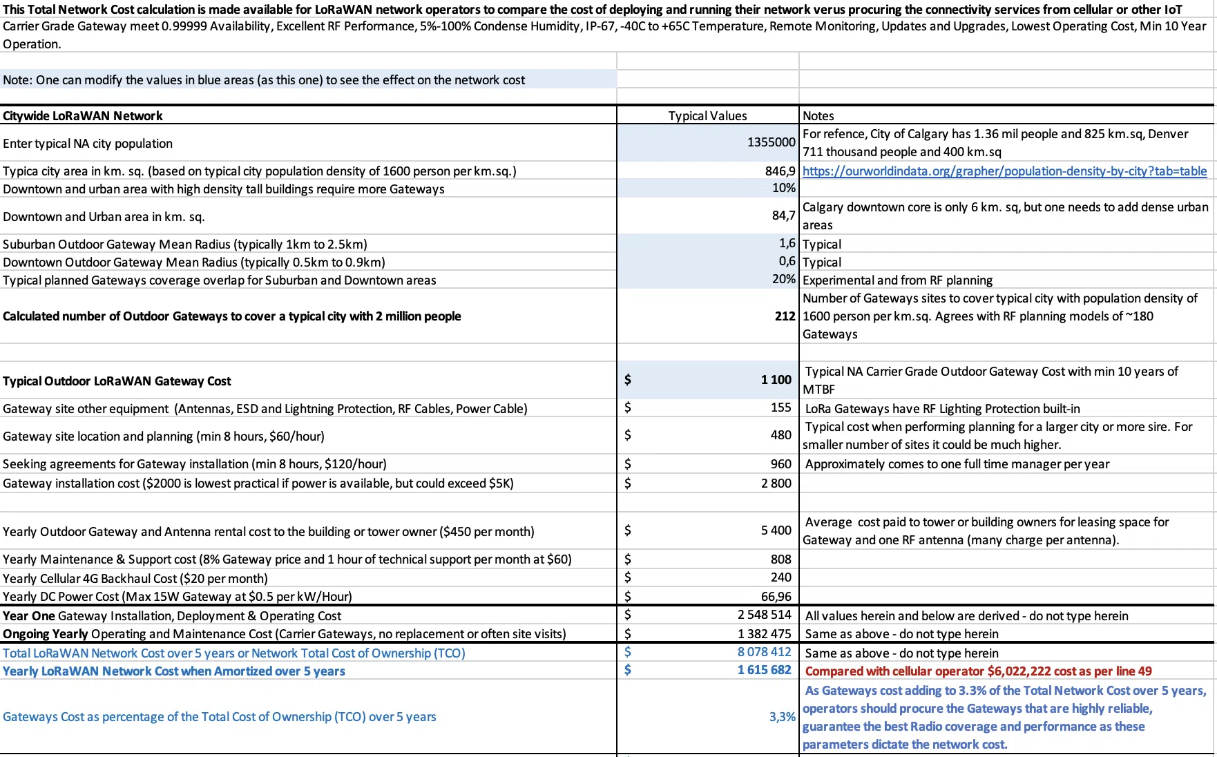 - Derive the LoRaWAN® network Year One Deployment Cost and Ongoing Yearly Operating and Maintenance Cost.
