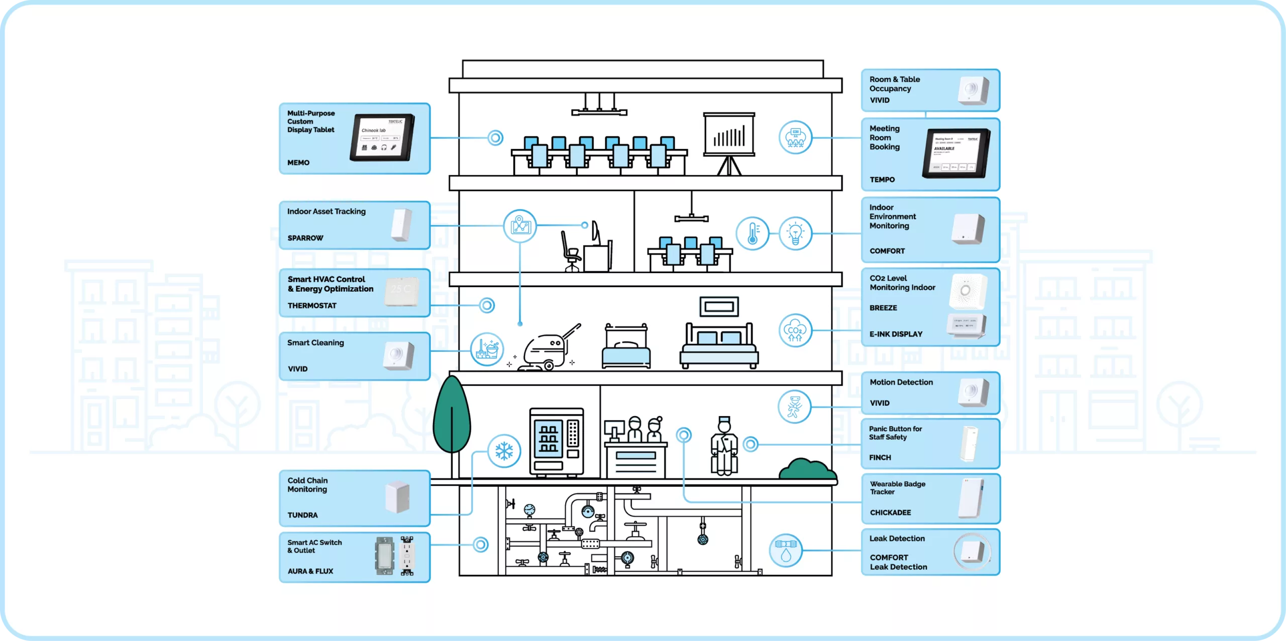 - Occupancy & Cleaning Optimization: VIVID & BREEZE-V sensors monitor motion and usage to optimize cleaning schedules.